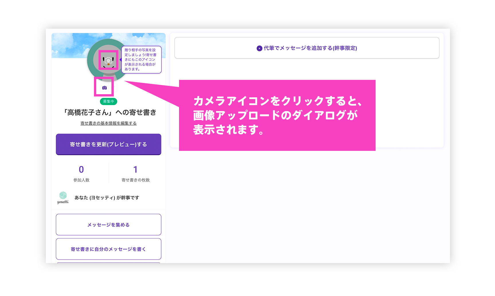 寄せ書きの幹事ページ内の個別のメッセージのアイコン上にあるカメラアイコンをクリックしてアップロードしてください。